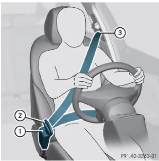Appuyez sur la touche de débouclage 1, maintenez la languette 2 et ramenez-la en direction du point de renvoi 3 de la ceinture de sécurité.